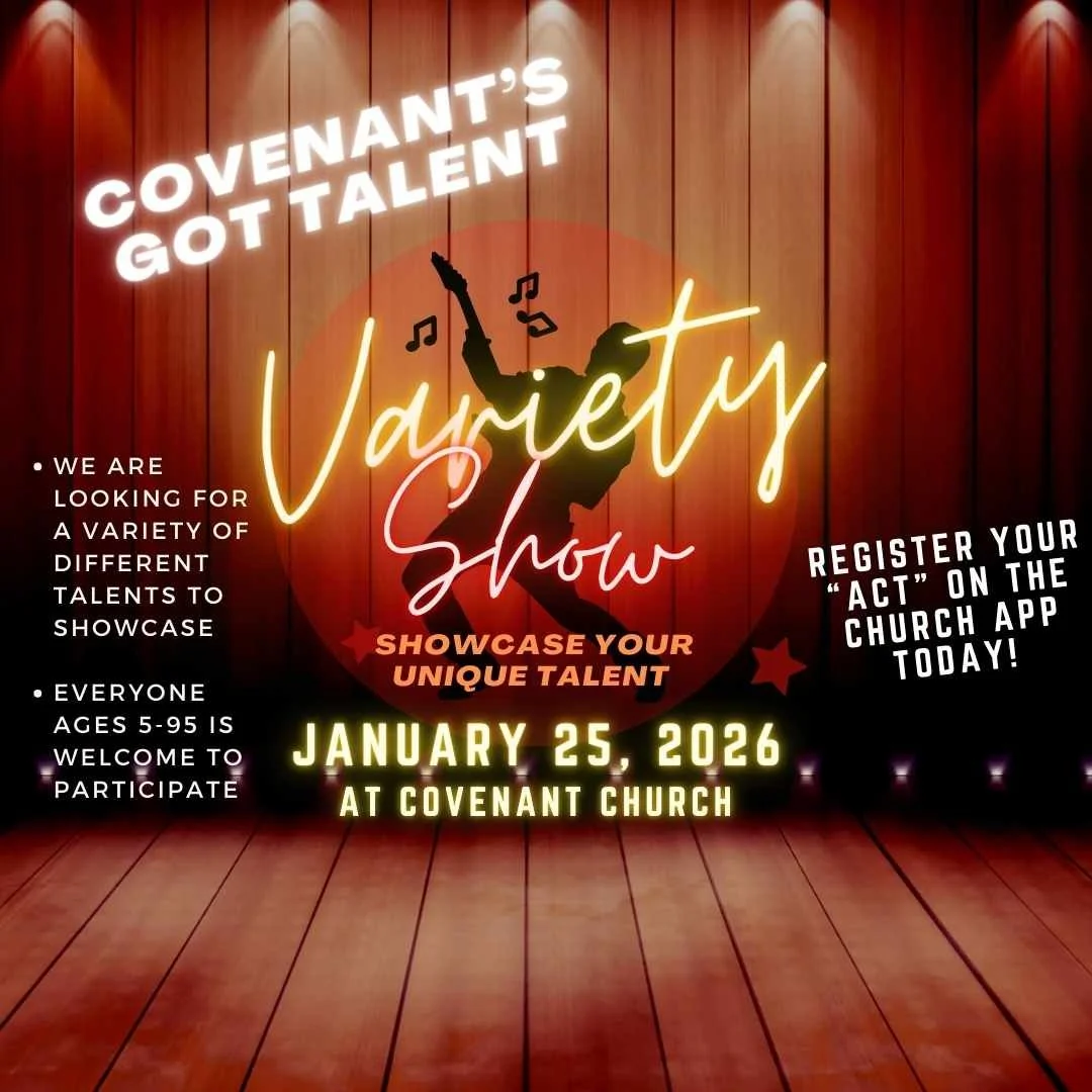 Youth Group students, join us this Sunday, January 25, at 4:00 PM for our next fellowship/community building gathering: The "Covenant's Got Talent" Talent Show.