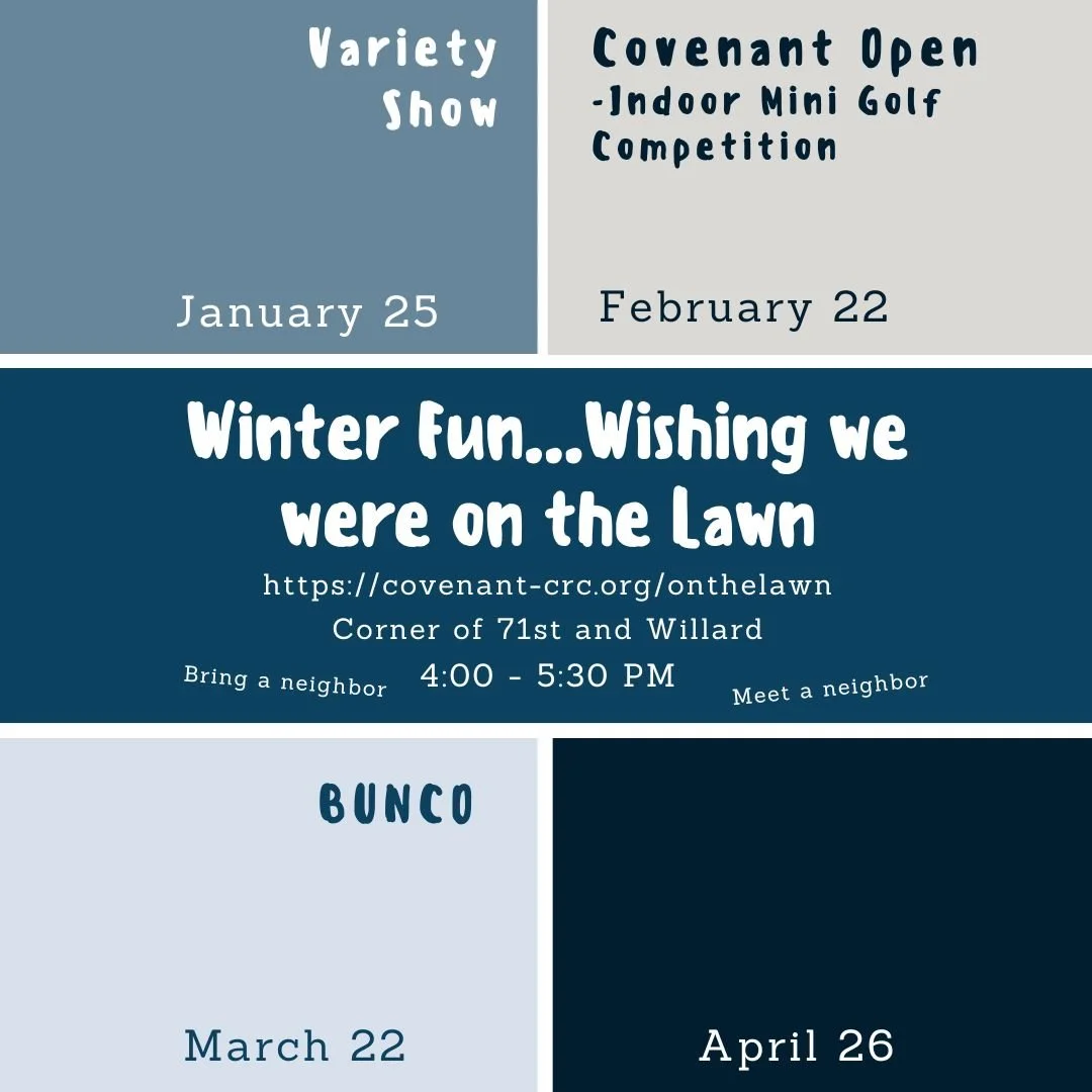 Join us this winter/spring on the 4th Sunday afternoon each month from 4:00 - 6:00 PM as we gather on the lawn or indoors to enjoy the fall evenings and also get to know each other better. Each Sunday afternoon, we have a different community-building activity planned. Check the schedule to the right and invite a neighbor, co-worker, or friend to come and join you. Bring a neighbor. Meet a neighbor.